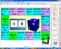 英文各單元更可搭配電子骰子和計分版為學習輔具,來製作大富翁遊戲評量如圖10,此部分需先行在WORD中先行設計好表格和表格內的題目,運用影像擷取功能將影像抓至編輯頁面,放入大富翁的元素,如人物、骰子、記分板,課堂中將學生分成兩組作競賽,學生在英文課運用互動式電子白板玩起英文大富翁遊戲,學習與歡樂的場景盡在課堂中,諸如此類的例子可以廣為收集和設計,並能隨時修改變換成老師所要的任何題目和形式。