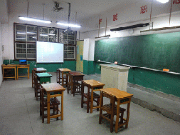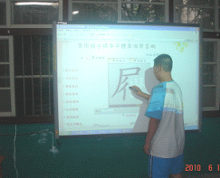互動式電子白板簡稱為IWB,硬體設備為大型的觸控板,需連結電腦和投影機來運作,教師可運用此設備在白板上做註記和書寫,教師的手指頭就是滑鼠,所有的教學過程皆可以運用此設備紀錄儲存,參見下圖1、2照片為電子白板在資源教室的裝設情形,本資源教室設計為普通班教室的1/2隔間,傳統黑板在前,而電子白板則固定在教室側邊窗戶位置,在使用此教室後,發覺好處在於教師有兩面的空間可以使用,可隨老師做彈性規劃運用,筆者在運用電子白板教學時,同時也運用教室的黑板作為增強板使用,此外,學生因背對教室門口,僅能面向白板,影響分心的事物減少,學生的專注力自然而然也提升了。