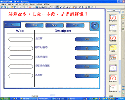 課堂進入總結時,老師通常會複習此單元的重點,此時則是進入互動遊戲評量的大好時機,以國文科最常使用的解釋配對則是利用此軟體的活動類模板Keywod match關鍵字配對為學習輔具(如圖8),老師只要拉出此模板進入編輯狀態,並將解釋和解釋內容打入後,便可進行一場互動遊戲評量,此時學生躍躍欲試,當一位學生上台與白板互動時,台上台下學生全體一起專注於白板,資源班小組教學中因人數不多,可以讓每一位學生都能輪流上台作答,而每一次的作答都讓全體學生多複習一次,也達到了一次一個主題的重複練習、精熟學習的機會,甚至可以在下堂課時做為引起舊經驗的活動。