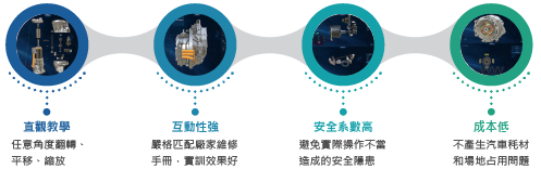 | 軟體為1:1建模,透過VR的方式模擬汽車總成的拆卸及相關原理教學,可讓學員進行發動機拆卸、變速器拆卸、懸吊模擬拆卸、煞車系統拆卸實訓。 |