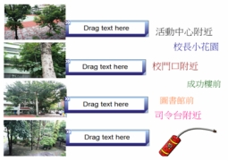 介紹完校園環境與植物後,搭配 SMART Board 軟體中的小工具,讓同學可以立即進行測驗,加深印象。而課程進行到此,便可發下學習單,讓同學親身走入校園,去尋找方才課程中所認識的植物、觀察這些植物的特徵。