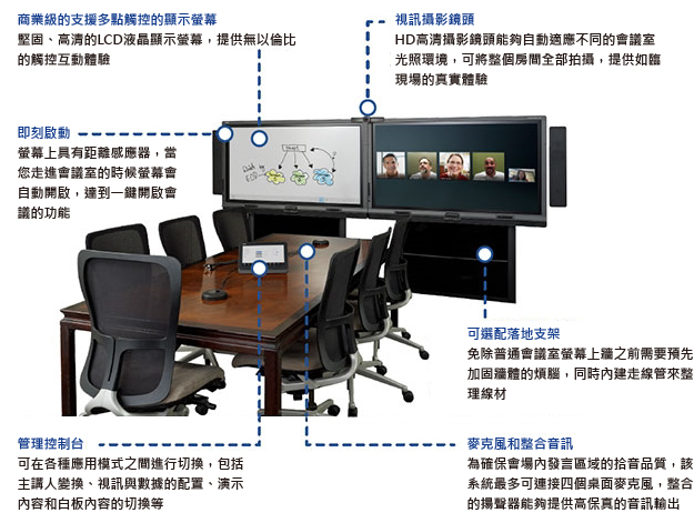 SMART Room System 是 SMART 和微軟合作開發的一套整合 Lync 軟體協作平台的一體化解決方案。它包括多點觸控高清顯示螢幕、HD 攝影鏡頭、麥克風和揚聲器,將高保真的音訊、視訊和更為重要的數據資料協作集於一身,還可以同用戶現有的 Polycom、LifeSize 等視訊會議系統無縫互聯,是新時代會議協作系統的不二選擇!