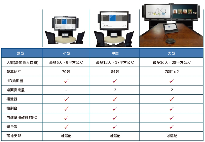 根據顯示螢幕尺寸及數量的不同,SMART Room System 共分為三種類型,您可根據您會議室實際情況選擇最適合的類型,SMART 能為您提供最佳的使用體驗。