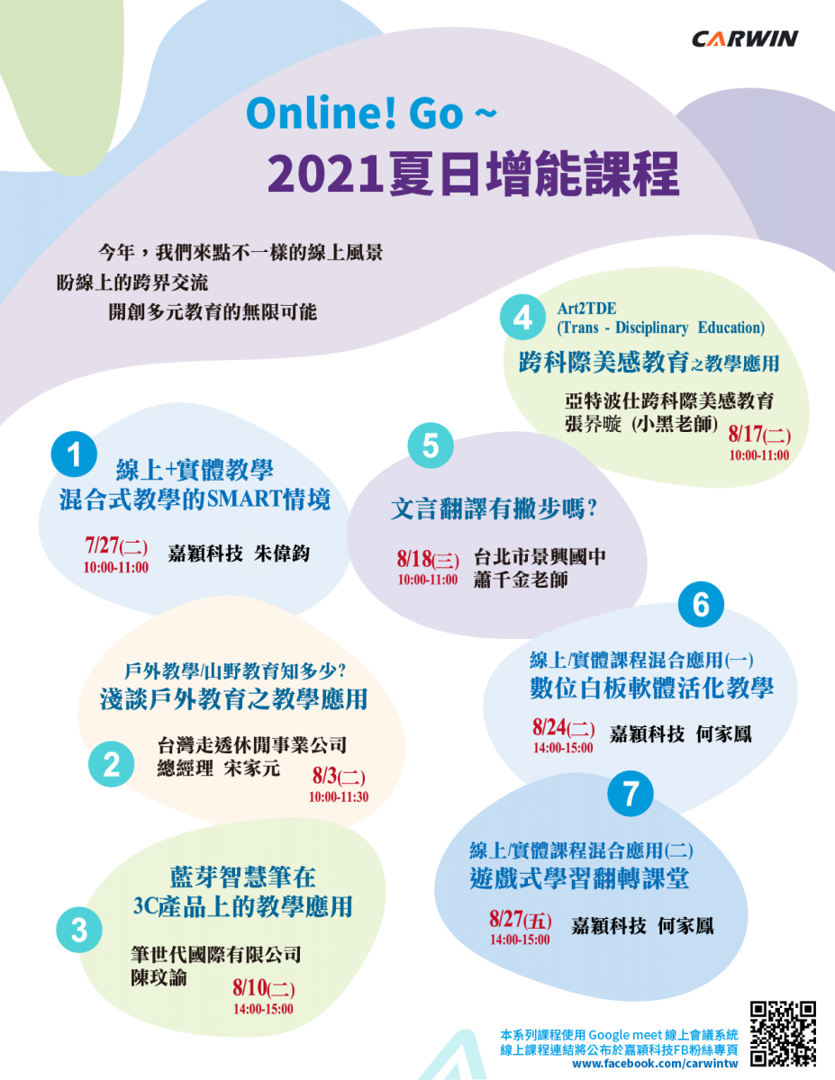 疫情期間,各行業均受影響,教育行業在極短時間內必須做各種應變,增能課程特別邀請戶外教學及美學教育專業的好朋友,也來跟老師們分享他們的教學經驗,盼線上的交流能開啟更多應用的可能性。