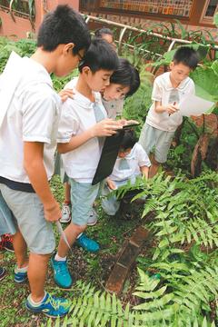 拿著行動載具,輕易查詢蕨類種類與特性。 圖/文昌國小提供 |