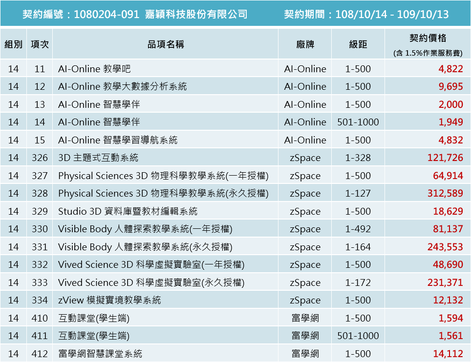 電腦軟體標(1080204)已在共同供應契約上提供用戶單位下單,嘉穎科技投標項次:有關zSpace 富學網等共17項產品項次,如下表: