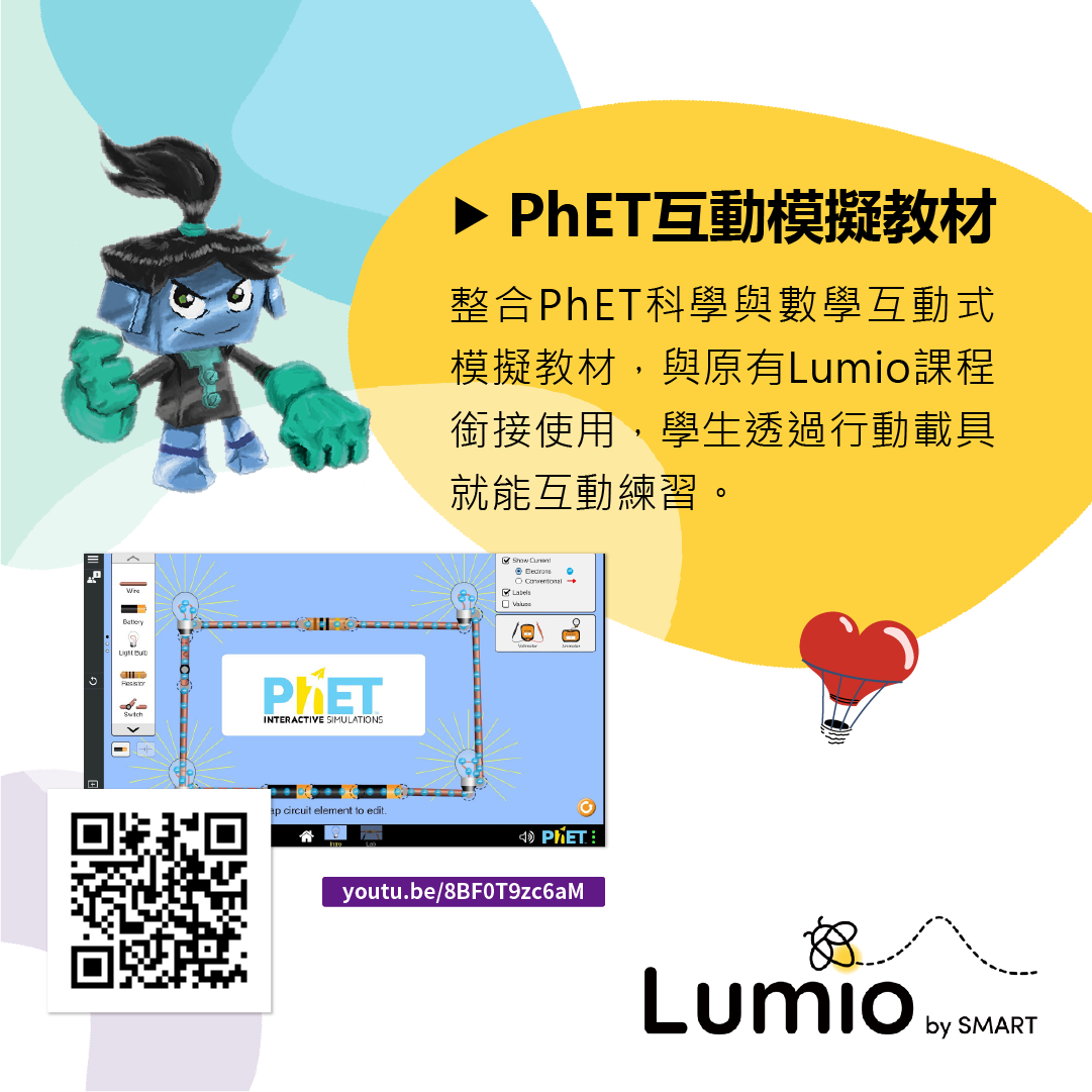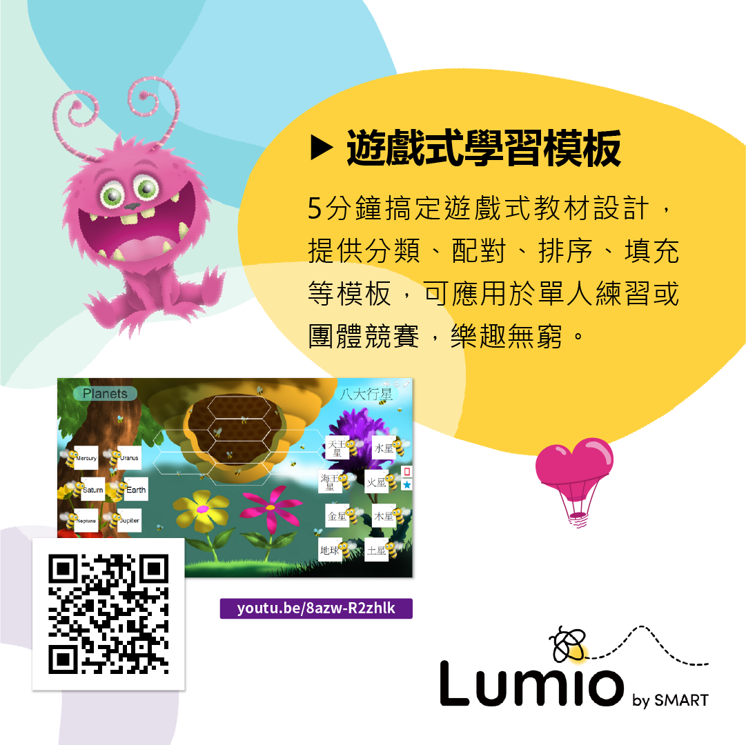 SMART Lumio 混合式互動教學平台整合多樣化的互動模板,包含遊戲式學習模板、PhET 科學與數學互動模擬教具、線上投票與評量工具、圖文便利貼等,幫助教師創造生動有趣的互動課堂。