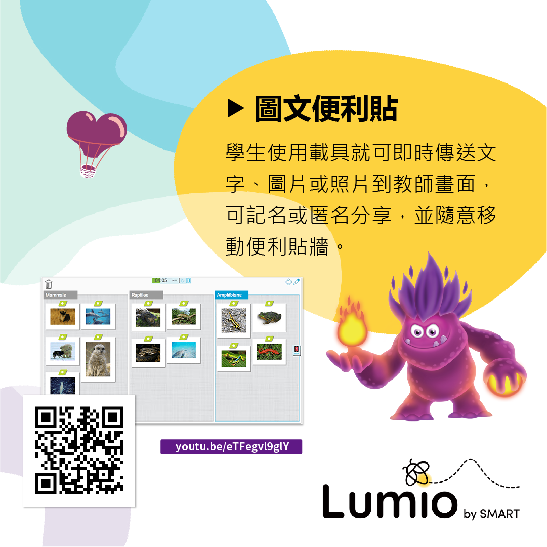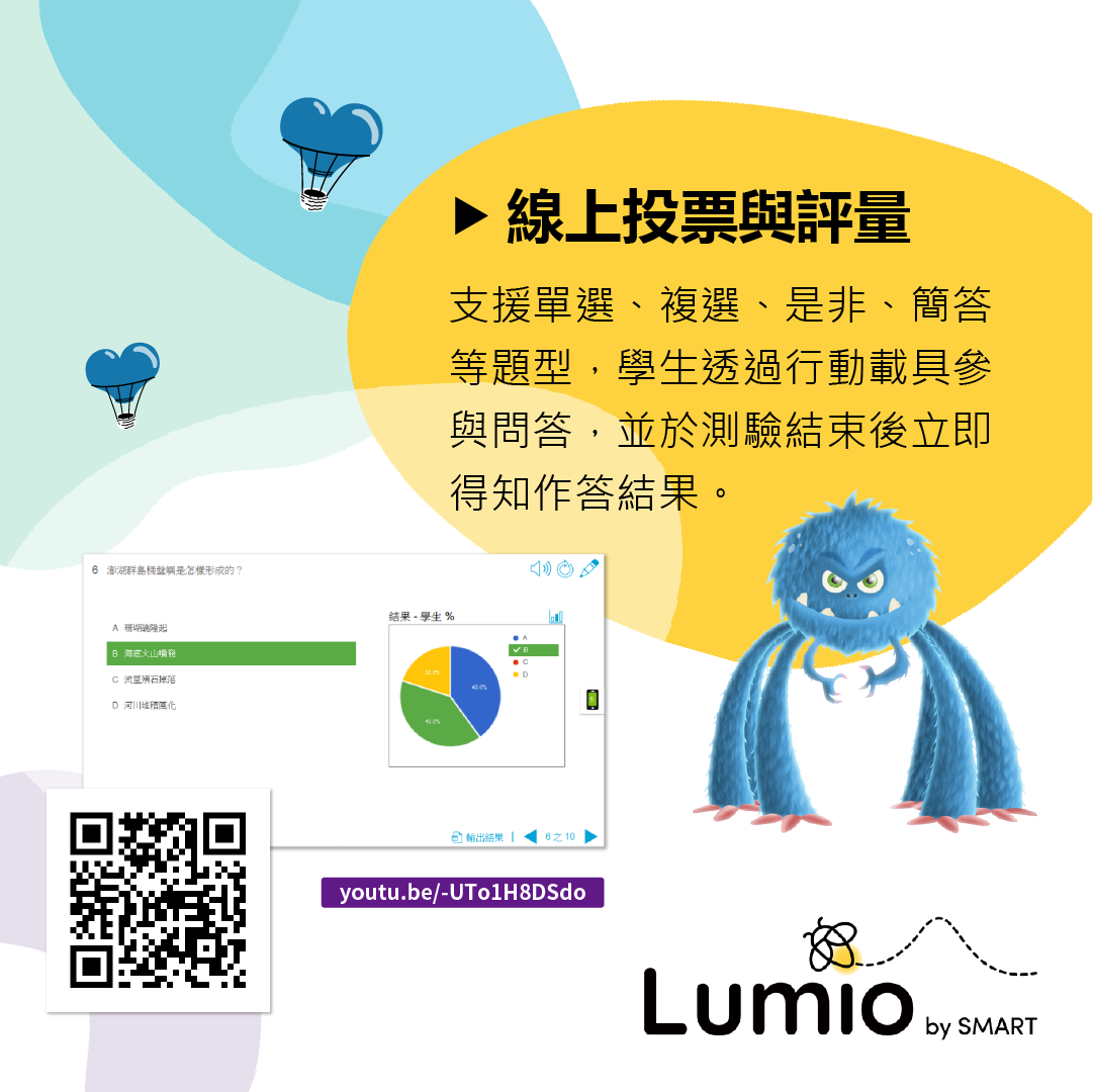 SMART Lumio 混合式互動教學平台 ( https://lum.io ) 無縫接軌的「生生用平板」的教學體驗,輕鬆串連現場教學、線上遠距與課後學習,營造更靈活的教學情境。