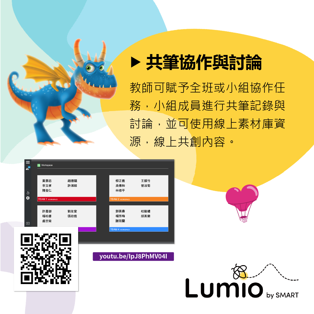 本期分享的SMART Lumio 混合式互動教學平台 ( https://lum.io ) ,將電子白板、線上便利貼、投票功能、協作討論、互動遊戲模組等一網打盡,師生免安裝軟體,透過網頁瀏覽器就能在 Windows、MacOS、iOS、Android、Linux等各種平台上進行跨載具、跨場域的教學活動,執行同步或非同步的學習模式。