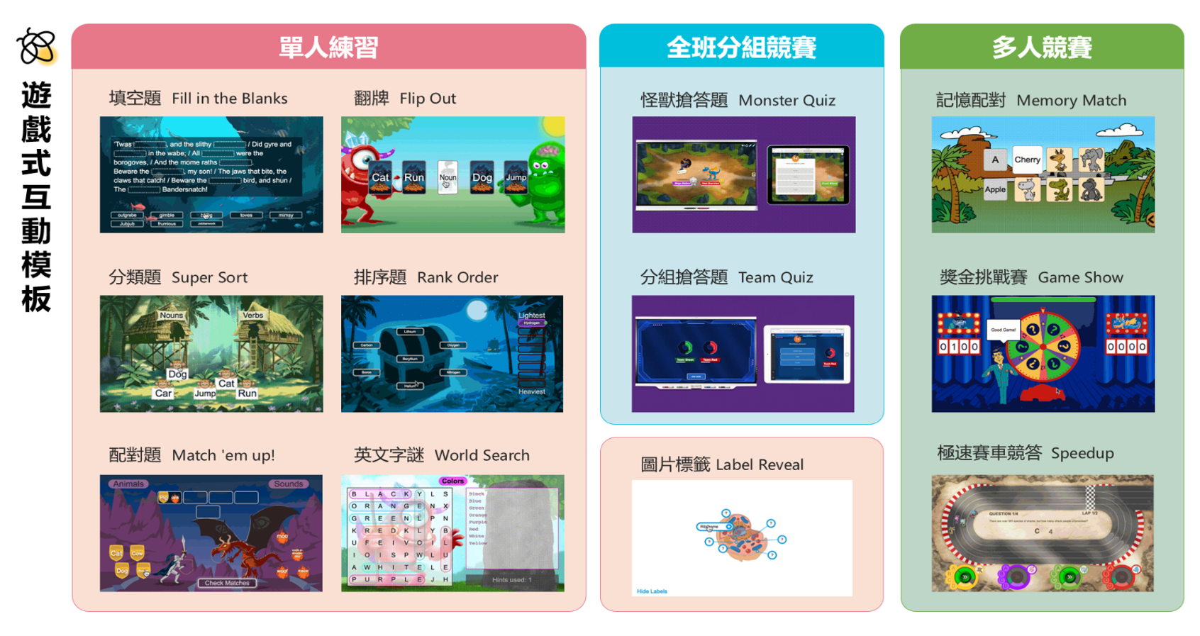 如果您喜歡Kahoot的線上評量及Pear Deck的師生互動,那您一定也會愛上SMART Lumio多元化的即時回饋與互動遊戲模板,教師只需變化題目內容就可快速產生多樣化的練習題,豐富圖像刺激的遊戲式學習,帶動學習動機較弱的學生。