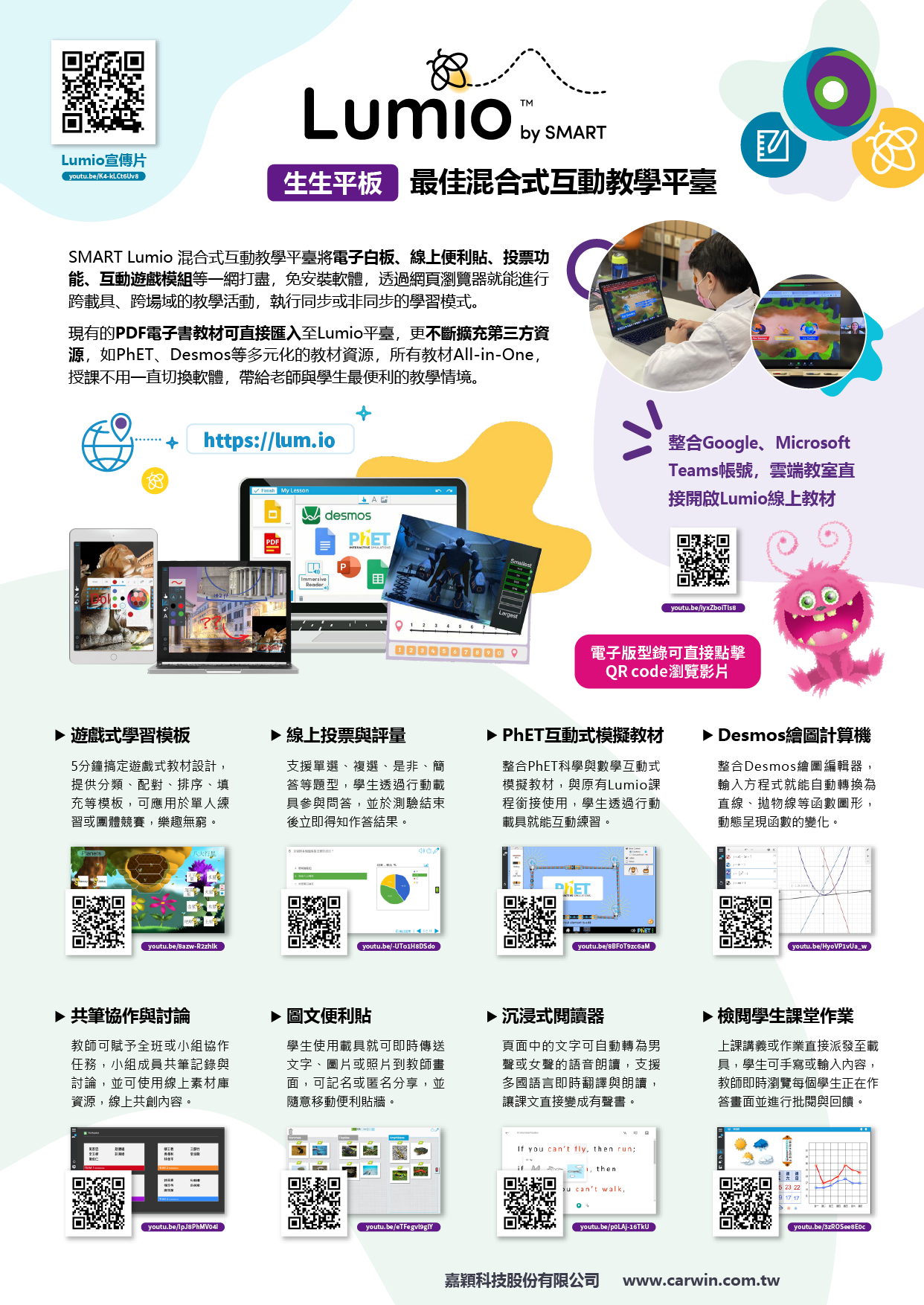 教育部推動數位學習精進計畫,打造「班班有網路,生生用平板」的智慧課堂環境,嘉穎科技推出的 SMART Lumio 混合式互動教學平臺 ( https://lum.io)) 經教育部審查通過,已入選 111年「教育部校園數位內容與教學軟體」的《第2組:課堂教學軟體》選購名單,歡迎大家選購。