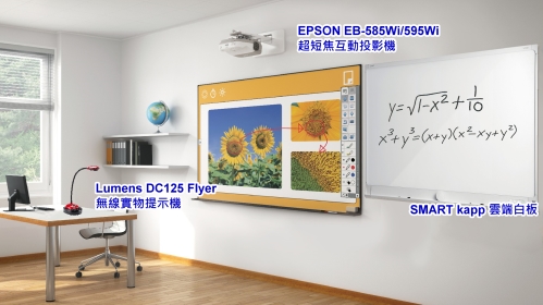 多年的教學e化演進,黑板並沒有消失在教室中,在互動式教學中依然有著不可取代的角色,但在教學過程中,教師無法即時擷取板書內容進行大量的訊息分享,學生易花時間在記錄筆記上。本案將 SMART kapp 雲端白板與 EPSON 互動投影機並存於教學環境中,保留傳統教學直接書寫授課的優點,輕鬆整合多媒體教學資源,還能再搭配無線實物提示機等資訊設備,提升 e 化教學的便利性,協助教師打造個性化的教學課堂。