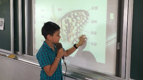 以暑假中進行學校蝴蝶營為例,喊出來 (Shout it Out!) 讓孩子透過行動載具共同發表看法來進行討論。活動中我們各組有不同的課題,有組別負責探究並解說蝴蝶的身體構造及成長介紹;有同學負責了解蝴蝶的食草蜜源植物;還有負責探討各種蝴蝶種類的特徵,龐大的數位資訊使得經驗生疏的孩子們摸不著頭緒,也不知如何抓住重點。老師將發現的問題提出,決定讓孩子自己幫自己解決問題:老師在 SMART Board 上開了3個頁面,各是小組負責探究的議題,引導學生利用擴散性創造思考策略盡情在這3個頁面中拋出想法,再由各組討論歸納後將大家的想法排列整理,順利的將探究議題清楚呈現並完成解說,條理清楚、內容豐富,這樣的活動引發大家的回響,他們因為從頭到尾不需要老師提出建議或方向而能獨力完成報告而感到自豪。除此之外「連連看」可以連結相關文字與圖片,將蝴蝶幼蟲與食草配對、「Label Reveal」能標出蝴蝶結構部位名稱,幫助學生討論及記憶。