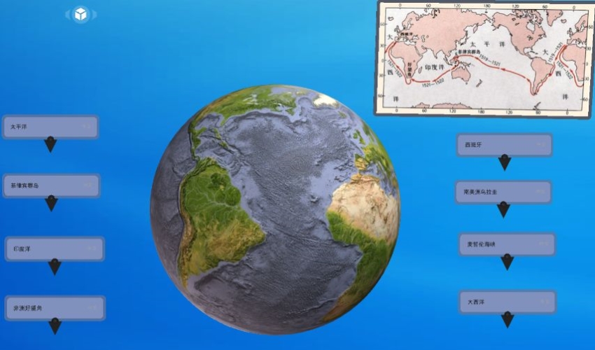 老師透過引導和資料閱讀,帶領同學們追溯人類認識地球的過程。利用 VR 在立體地球上,找一找麥哲倫環球航線經過的主要地方,增強學生對大洲、大洋的初步認識,感受地球是個球體的過程。