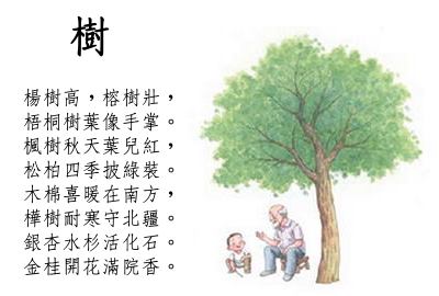 透過閱讀短文、觀看樹木圖片或模型,初步瞭解十一種樹木的名稱和基本特點,累積有關描寫樹木的詞句。