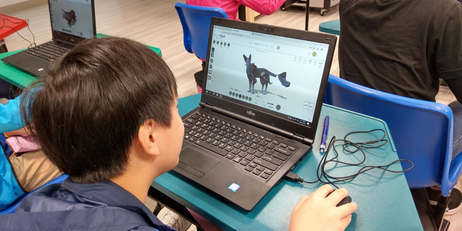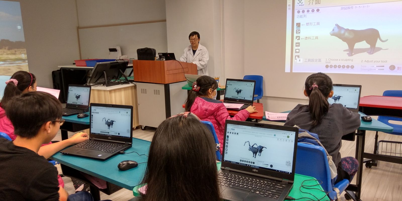陳思羽老師帶領孩子們熟悉 3D 設計軟體 LEOPOLY 的操作,運用虛擬雕刻技術,孩子們就好像捏黏土般可以將小貓咪模型進一步塑形、上色,將天馬行空的創意變為現實可見的模型。