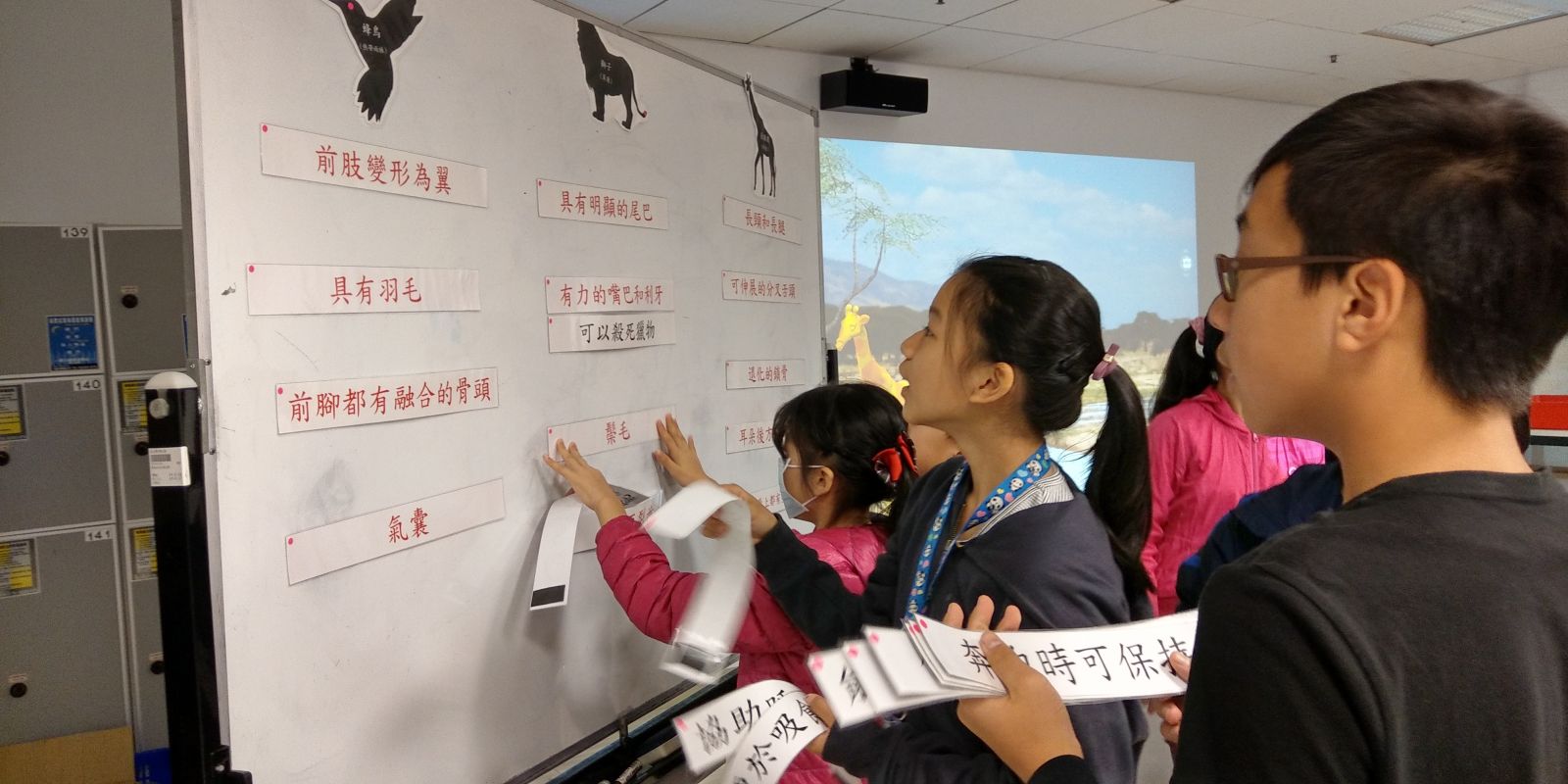 陳老師以達爾文雀為例,帶領孩子們認識達爾文的演化論,物種經過天擇後,會留下能適應環境的特徵。分組讓孩子們將蜂鳥、獅子、長頸鹿、駱駝和鯊魚等五種動物的身體特徵找出來,並透過閱讀相關的文章,分辨動物每個身體特徵在自然環境中生存的作用。接下來,與孩子們討論如果這些動物更換了不同的生存環境後,牠們可能會面臨哪些情況?