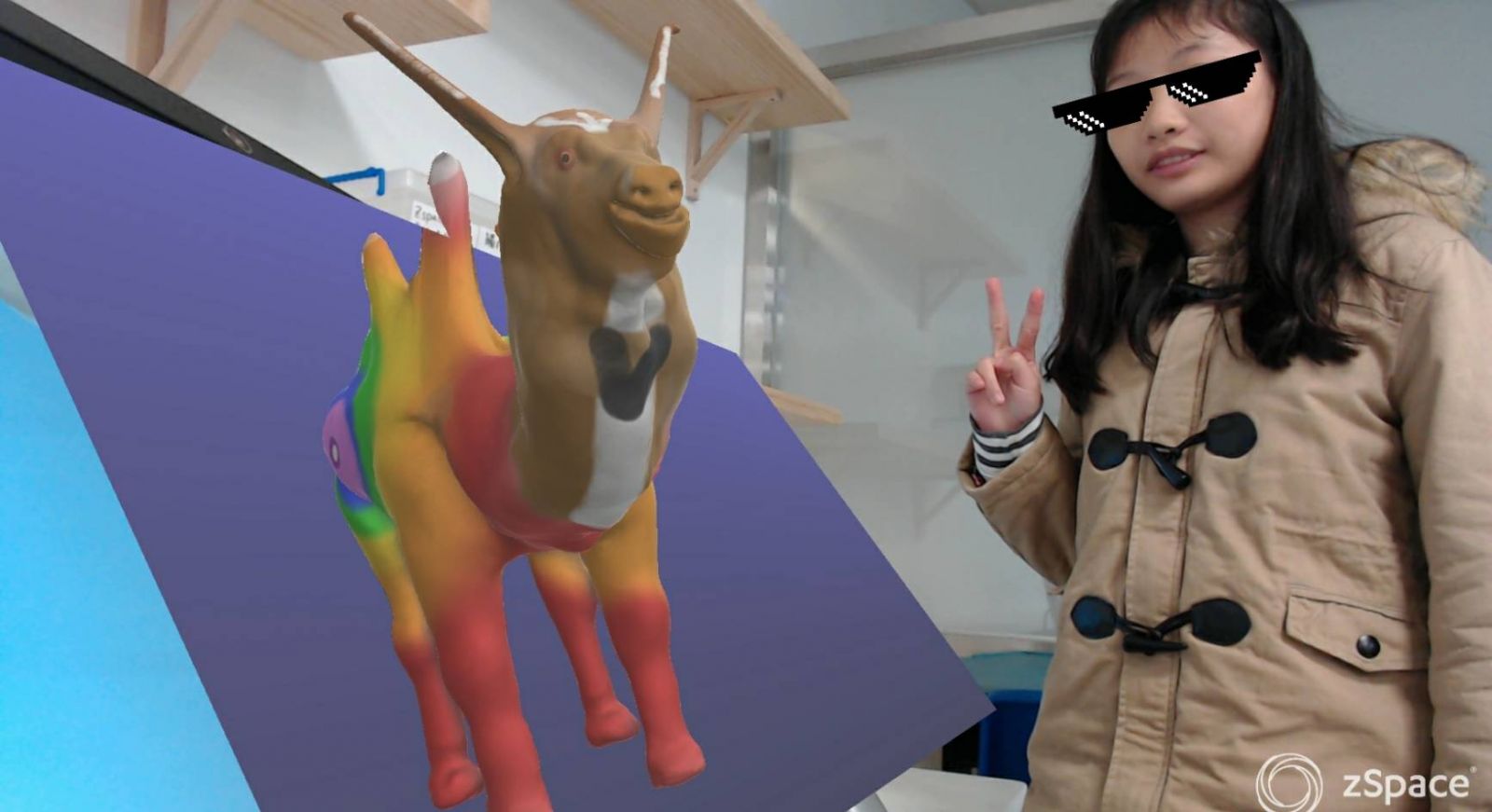 孩子們將設計好的太空獸匯出為 3D 物件的 OBJ 檔案格式,並上傳至 MERGE CUBE 平台,孩子們手持魔方,就能在電腦鏡頭前看到設計成品。同時,也能將 3D 模型匯入至 ZSPACE 中,藉由 ZVIEW AR 模式,這些太空獸彷彿從螢幕中跳入現實環境,孩子們都興趣盎然地與自己設計的太空獸拍照合影留念,體驗 AR 擴增實境的獨特魅力。