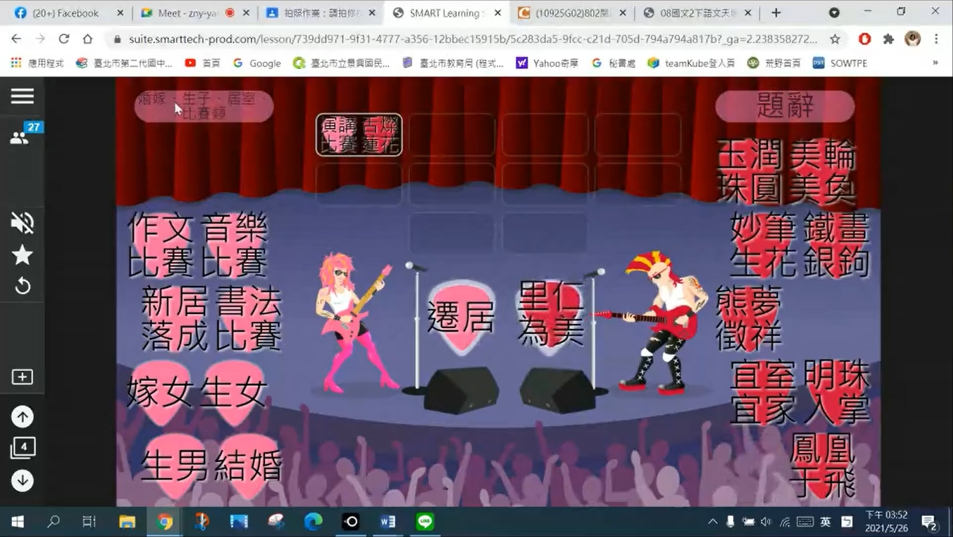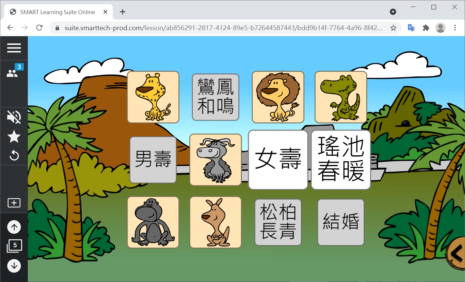 線上課程開始後,讓學生先自學十五分鐘並在課本做筆記,接著,就請學生進入SMART Learning Suite線上教室,每位學生都能在各自的電腦上進行題辭的配對、選擇和問答互動遊戲,依照自己的步調操作練習,老師也會在每玩完一個互動遊戲模板後詢問學生如何答對的?有哪些關鍵字可以幫助他們完成活動,透過互動性高的遊戲式模板,帶動學生的學習興致,更加積極投入學習。