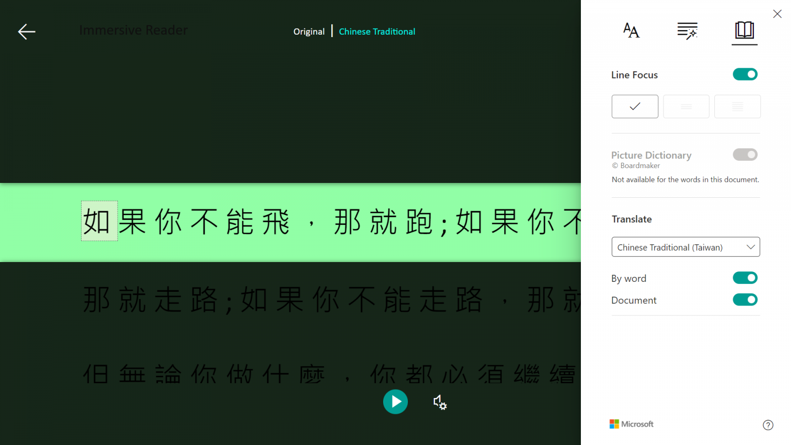 Lumio 與沉浸式閱讀器的整合,提供了文字到語音的轉換、文章翻譯和其他的文字閱讀輔助功能,可以幫助學生解讀無法理解的語言。學生可以用不同的顏色和段落間距來突顯文字,也可以透過圖片字典來理解單字意義。