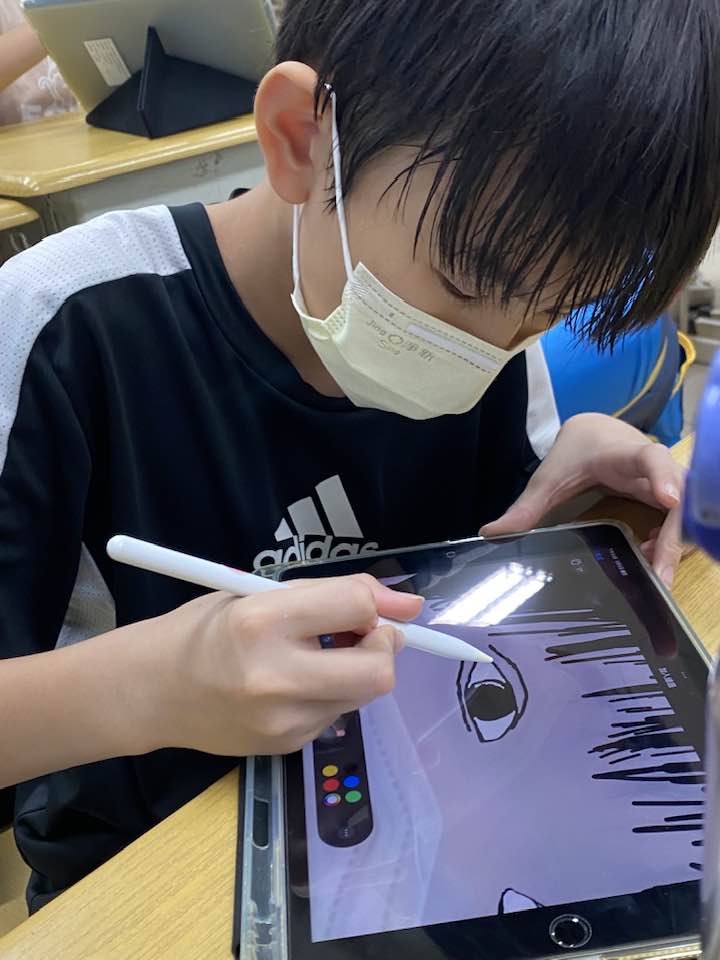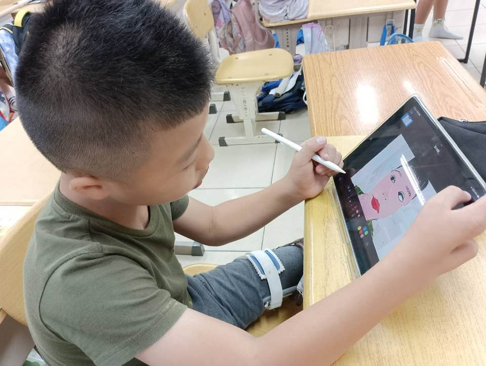 課程一開始,潘老師引導學生使用 iPad、Apple Pencil 和 Keynote 等數位繪圖工具,讓他們輕鬆進入數位藝術的創作領域。學生們對於用這些科技工具來繪畫感到新鮮又興奮,不時驚呼:「原來iPad也能畫出這麼酷的東西!」