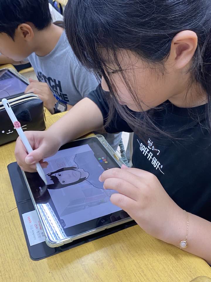 為了讓自畫像更具個人特色,學生們先用 iPad 拍攝自拍照,細心觀察自己的面部特徵與表情變化。接著,運用 Keynote 的數位畫筆勾勒出自己的臉部線條,大膽嘗試不同的色彩搭配與筆觸變化。隨著創作的進行,學生們不僅練習數位繪畫技巧,更學會如何運用視覺元素展現自我風格,讓每件作品都展現出創意與個人特色。