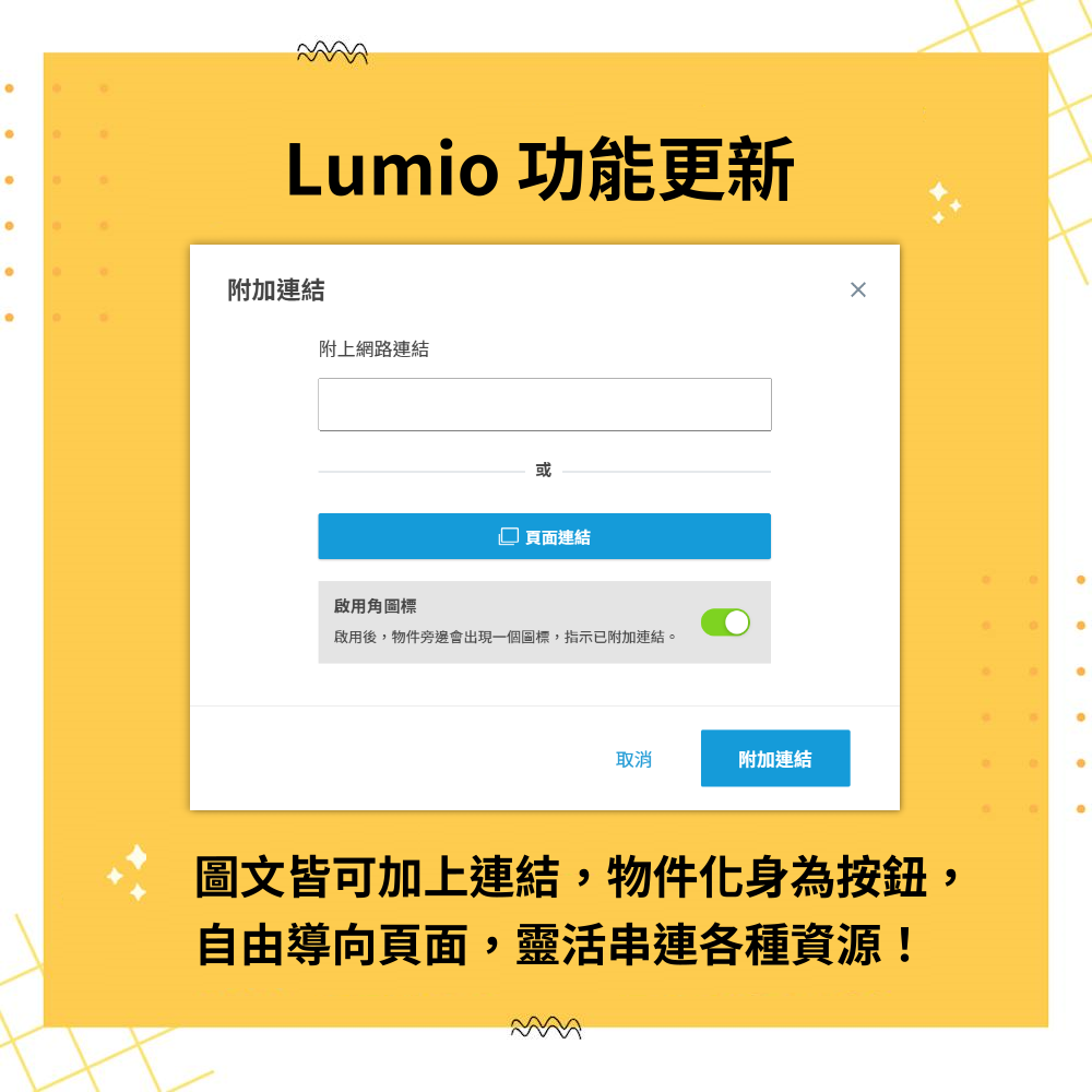 課程中的圖片、文字、圖形等物件現在都可加入超連結,自由導向其他 Lumio 頁面,或是連接至外部資源和補充教材,幫助學生更深入理解學習內容。連結形式可設為邊角小圖示,或讓整個物件成為互動按鈕,讓學習流程更直覺、更順暢。
