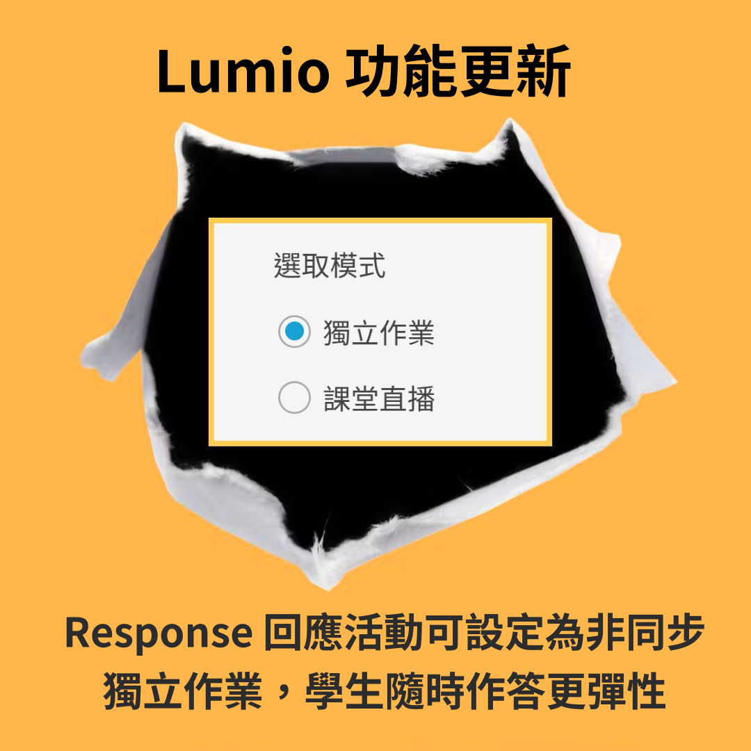 Response 回應活動現已支援非同步作答,可設為獨立作業讓學生依照自己的進度完成練習,適用於課中的自主學習活動或課後複習。同時,原本的 Live 模式仍保留,讓教師可依需求彈性搭配不同教學情境。