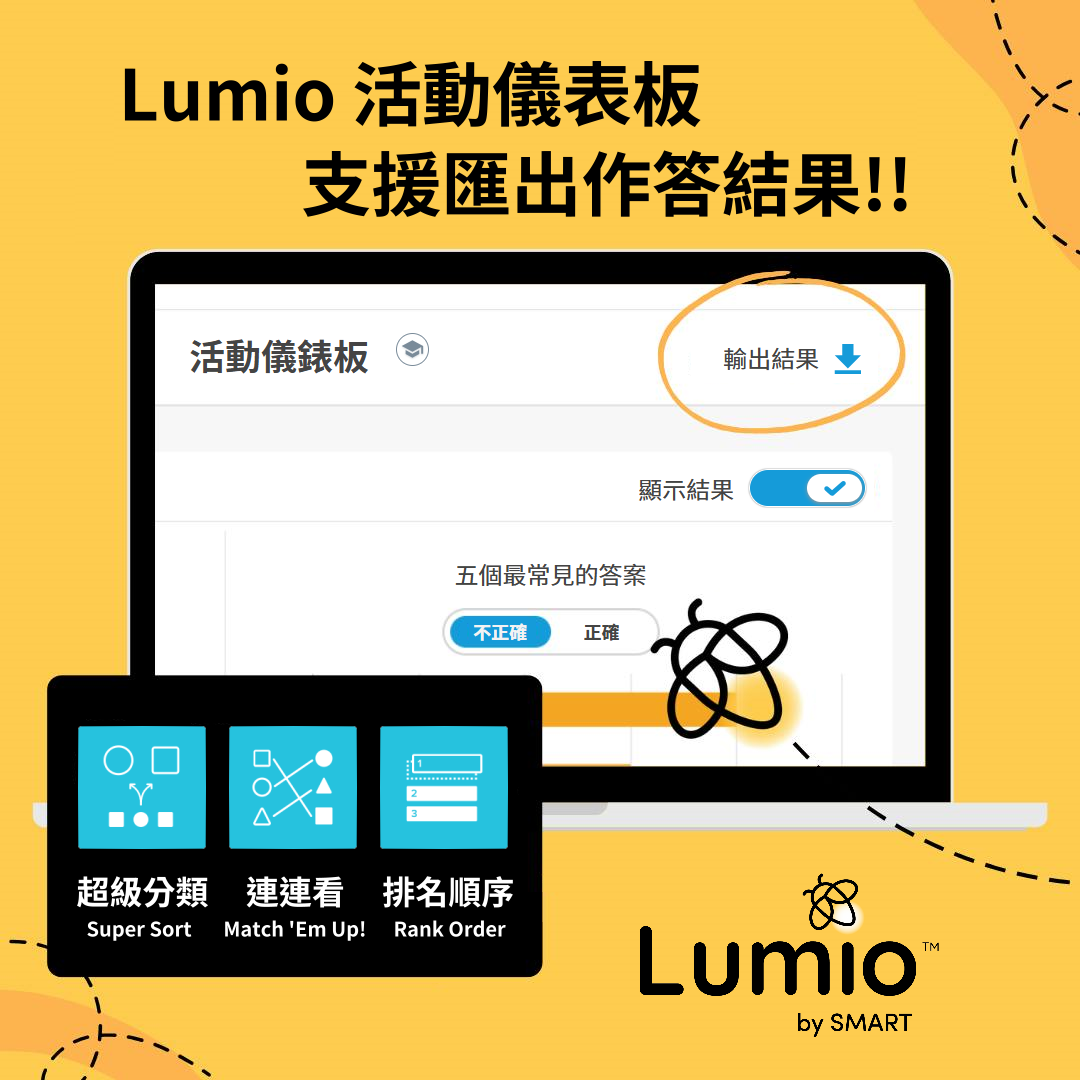 超級分類、連連看、排名順序:教師可透過活動儀表板即時掌握學生的學習狀況,並將學生作答結果匯出為 CSV 檔案。
