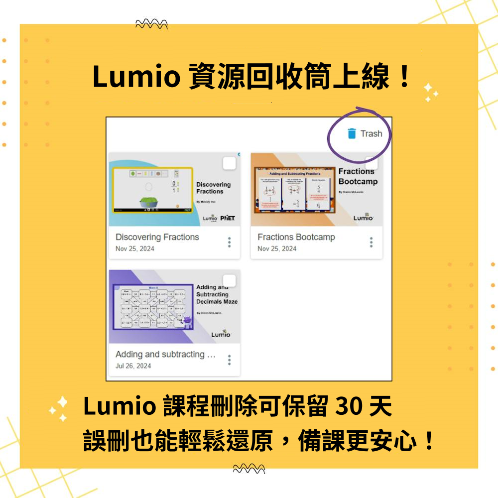 「我的資源庫」現已新增回收桶功能,可自動保留刪除的課程內容 30 天,隨時可還原,備課更安心,再也不怕誤刪重要教材!