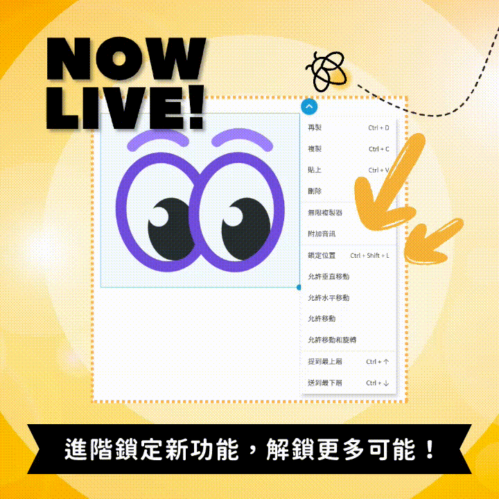 全新進階鎖定功能讓物件操作度靈活升級,教師可自訂物件的移動、旋轉與縮放限制,更有效引導學生的操作。此功能不僅能鎖定位置,還能設定只允垂直移動或水平移動,甚至在不改變大小的情況下自由移動與旋轉等條件設定,適用於排序時間軸、平移坐標等互動設計,讓教學活動更具創意與結構性。
