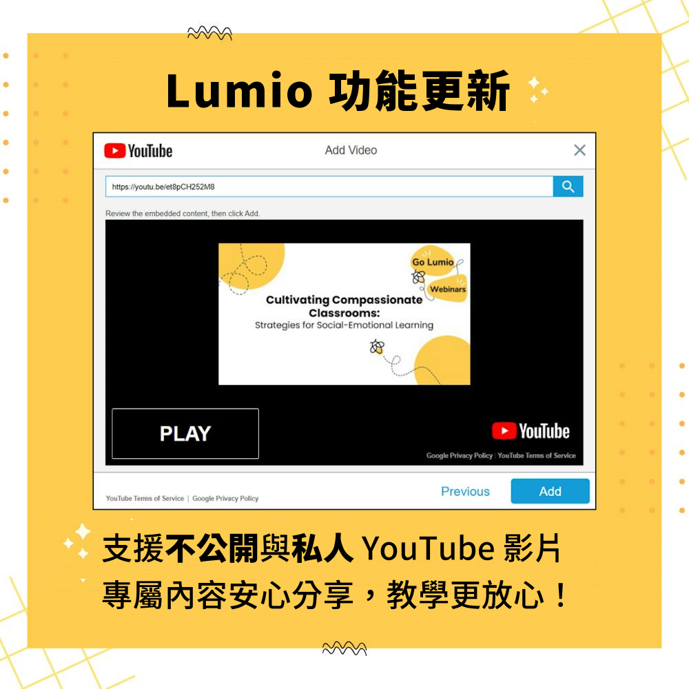 現在可直接在 Lumio 中播放私人與非公開的 YouTube 影片,教師可分享只授予學生觀看的專屬內容,且不受廣告干擾,提供學生更安全、專注的觀影體驗。幫助教師輕鬆整合視覺教材,教學更流暢。