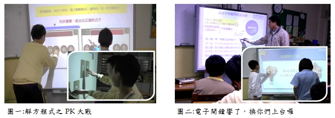 在為輕度學習障礙者編製的代數單元裏,我大量採用了 Notebook 的課堂互動小程式,如配對、組合排列、骰子、量角器、天平等,先吸引學生上台操作,再用翻面及撲克牌等元件,設計十點半遊戲及魔術預言等活動,讓代數概念有趣味性及互動性的包裝。有一次校長巡堂時觀看到我用電子白板上等量公理,之後很好奇地問我那個天平及測驗題是如何製作的?會不會花很多時間呢?其實都是 Notebook 的功勞,讓我輕鬆上手又節省時間呢?