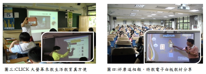 過去對智能不足者的生活教育,如用餐禮儀、盥洗等教學內容,常是教師需親自示範,同時也要兼顧學生操作學習,令教師在教學現場常感分身乏術。雖有些教師改用單槍投影教學,但仍會被侷限在電腦旁操作按鍵。有了電子白板這個超大電腦螢幕之後,我們將這些教材全部規劃成直接 CLICK 螢幕的方式,教師可迅速點選示範影片,藉由大螢幕的播放讓學生皆能觀察清楚及反覆仿作,教師則可專心去指導學生,於是電子白板成為新的教師助理,而教室彷彿變成有兩位教師了。