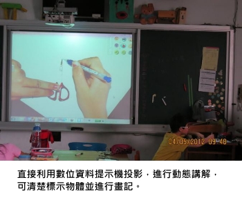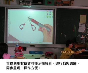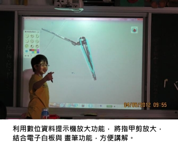 就自然課而言,雖然老師事先用電子白板軟體備好教學內容,但由於課程貼進生活,在課堂討論中,往往能激發孩子相當多的想法,更甚者,孩子們的創意遠遠超出老師既定的教學內容,「即時性」的融入教學流程中,成了老師的一大考驗,此時,引進科技工具便成了教學的考量。過去,雖然可利用相機、錄影機捕捉畫面,再透過電腦製成教材,但往往需要時間。若是接上傳統式的實物投影機,不但體積大佔空間,因傳統實物投影機不支援電腦,老師教學時必須在電腦與實物投影機間不斷切換,不但耗時,也影響教學流暢性。但新式的 Lumens 數位資料提示機則大大克服了這樣的缺點,體積小、具 USB 介面支援電腦,與 SMART Notebook 軟體相容,教學使用上相當便利。