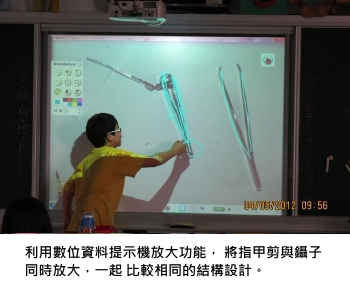 以最近的自然課「槓桿原理」為例,我讓孩子們尋找生活中應用槓桿原理的工具,製成簡報上台報告。孩子們帶來許多工具進行簡報與示範,例如:鉛筆、剪刀、老虎鉗、鑷子、指甲剪…等等。這些東西體積並不大,在目前小學一個班有三十多個人的大班教學環境中,若要講解、示範,讓每個學生都能清楚觀看物體構造,明白各部位功能,是有相當的難度。但由於 Lumens 數位資料提示機介面容易上手,孩子也可以輕鬆操作。藉由 Lumens 數位資料提示機(實物投影機)與電子白板的結合,不但可以利用放大功能,清楚呈現物體,並能同時在白板上標示出「支點、施力點、抗力點」,畫線標記比較「施力臂與抗力臂的大小關係」,研究工具究竟是省力的設計?亦或是費力卻方便?在報告過程中,孩子可以實際操作如何利用老虎鉗省力工具的設計去輕輕鬆鬆剪斷鐵絲,甚至可將這樣的動態操作過程利用軟體中的錄影功能記錄下來呢!