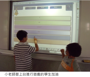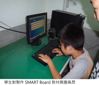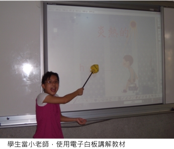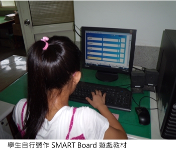 相信許多教師對於六年級下學期學生的上課狀況時常感到頭疼,我讓這些心神不定的孩子們自己設計學習內容,包含學習、練習、遊戲和評量。多數學生要求使用電子白板的內建 Flash 當作遊戲,這些學生利用下課時間來跟我學習編輯 Flash,孩子們非常有成就感。這些種子學生也會再教其他同學使用 SMART Board 軟體。不知不覺中,學生主動預習了教材內容,還能上台當起老師教授課程,使他們成為課堂上真正學習的主角。