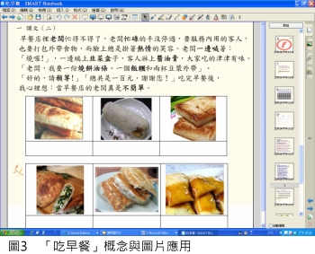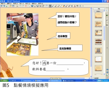 語文課程運用軟體提供的具體圖片來解釋要表達的內容,例如:教導「烤肉」這個語詞時,則呈現烤肉情境的圖片、教導「吃早餐」(如圖3)的概念時,則呈現吃早餐的情境圖片;數學課程則運用圖示來輔助學生理解應用問題,例如:教導用錢(如圖4)時,放入錢幣和紙鈔的圖片,用圖片來呈現要購買的物品。運用電子白板可以很快的建立情境圖,例如在點餐的情境中,老師可以運用圖片呈現櫃檯和點餐單(如圖5),以利學生可以做角色扮演和對話。此外運用學生自己的照片和圖片套入欲學習的句型,例如:「○○最喜歡○○課,因為可以○○○○」,在圖示的教學下學生能和老師進行對話練習(如圖6);且在教學活動中也發現,學生對白板的眼神接觸在跟以往使用黑板做比較,有明顯的提升。
