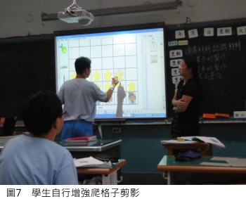 每次課堂進行前,老師會運用電子白板的增強版點名,增強板會放入學生自己的相片,運用表格功能讓學生可以爬格子來呈現本節課的表現(如圖7、8),再運用無線複製器的功能,將學生喜愛的增強圖片預先排列在空白處,當給予增強時,則讓學生自行選擇圖片放入增強版的格子中,當學生上台表現良好時,老師會下指令讓學生自己做增強動作,在多次的操作下,每位學生都能自行拉獎勵圖到自己的照片上方,在執行增強制度一段時間後,偶然一次進行課堂評量,並未如慣例的進行點名時,學生便會堅持並做出詢問,上課一定要點名。