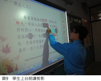 課堂中會進行朗讀訓練,自閉症學生幾乎不會配合別人做朗讀練習,將教材放到白板上請學生朗讀時,必須要每一位學生分開來讀,學生上台朗讀時會用手指著文字並跟著朗讀速度移動(如圖9),當每位學生都朗讀過課文後,最後的同聲朗讀會由老師指著白板文字並使用色彩線條跟隨朗讀速度移動(如圖10),大家的眼神需與白板一致速度的前進才能完成任務,朗讀的部分經過多次的練習後,慢慢有學生出現跟讀的反應,此跟讀是指跟著同學和跟著老師的手指同時進行下,這在與過去只看自己教材上的文字朗讀做比較,更多了學生彼此的互動和合作練習的機會。