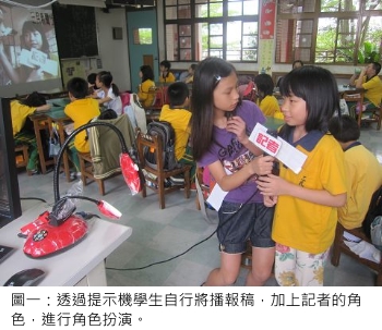 曾經全班閱讀國語日報報導林來瘋事件時,靈機一動,讓孩子們化身為小記者、小主播念讀,想不到在班上擦出了燦爛的火花,為了練口條,孩子們下課主動拿起報紙咬文嚼字的念讀文章,心生若能仿照電視主播播報每天在班上午餐時閱讀例行事「3+1」,應會有更讚的效果,於是告訴孩子,當天的分享者,可化身為主播,在電視螢幕上播報新聞,孩子興奮的問老師操作方式,我說:「這學期班上新朋友『Lumens 實物提示機』,平常我們上課將他用來訂正文章及考卷,大家反應這款投影機投射出來的影像看得超級清楚,再加上有錄影的功能,老師決定將提示機當鏡頭,在播報新聞的同時,開啟同步錄影,事後請大家看看在鏡頭前的成果。」此舉使他們更用心利用下課時間念讀自行挑選文章,實地開播後現場氣氛緊張及興奮,而主播的背景為孩子們真實生活情景,更顯逼真,班上閱讀情況也因老師小點子及好用的E化設備達到意想不到的結果。