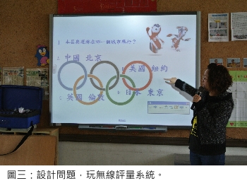 此舉確實讓孩子的眼光轉回讀報上,打鐵趁熱,於是每天請學生設計三個提示加一個問題,在午餐時間將講台變身成專業主播台後,參與搶答的機會,為達到有效的學習,當主播播報結束後,會輔以 SMART Response 無線評量系統,老師每天從文章中出三個問題,請學生以無線評量即時給予回饋,瞭解學生對於該篇文章的瞭解及聽聞程度,一段時間後運用標準化測驗(師大研發的聽覺理解測驗 G34、周台傑教授研發的國語文能力測驗四年級)檢測該三加一活動,對於學童的語文能力提昇程度及優勢、弱勢能力作為未來課程的調整教學法。