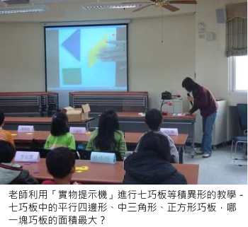 「實物提示機」可解決老師操作教具教學時的不便與困擾。老師可透過「實物提示機」來佈題或公佈答案,學生可清楚看到老師的說明與操作過程。而先解題成功的學生,可上台在「實物提示機」下,操作、說明自己的拼法(例如:用五塊巧板拼出正方形、用七塊巧板拼出正方形)。能力較弱的學生可透過觀看與聆聽來學習,老師則可在一旁給予「個別指導」。自從認識「實物提示機」的好,進行七巧板教學時,我不用再大包小包的攜帶磁鐵教具,只要「實物提示機」就搞定。最後,還可在「利用七塊巧板拼出自己喜歡圖形」的創意造型活動中,利用「實物提示機」中「拍照」的功能,將上台發表的學生作品一一拍下,進行「最佳創意造型」的票選活動。因為有「實物提示機」這個教學小幫手,一節課的教學更有效率。