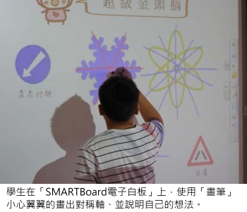 「SMARTBoard 電子白板」觸控靈敏、好用、易上手的特性,不但讓身為老師的我在教學上如虎添翼,也讓學生在活動中經常搶著上台使用「畫筆」圖示、說明。每當學生拿起觸控筆解說時,彷若自己就是老師,小心翼翼的畫圖、說明,深怕一小疏忽就難逃台下同學的「法眼」。這麼好用的教學法寶與學生爭先上台的神情,至今讓我津津樂道。回想起自己平日所使用的「虛擬電子白板」,一遇到操控器「筆大師」接觸不良時,老師為了要操控電子書裡的媒材,常常得來回奔波或是被迫站在電腦前面(通常是在教室的角落)上課。而學生上台分享時,也常因拿捏不到技巧(操控器「筆大師」得要傾斜 45 度角)而無法圖示、佔據過多的教學時間……。