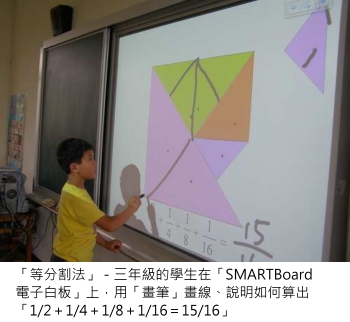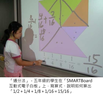 「我是用通分的!」五年級的學生一上台,就展現其學習的優勢。一拿起觸控筆在白板上寫下「8/16 + 4/16 + 2/16 + 1/16 = 15/16」。「『通分』怎麼算呀?」 「把每個分數都化為 16 分之幾!分母乘多少,分子也要乘多少!」小女生一聽到台下同學的提問,一邊寫、一邊說明自己是如何「通分」的。