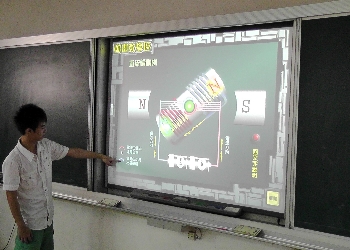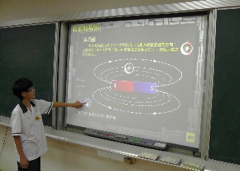 在講授電與磁的範圍時,肉眼看不到電與磁場,就算以鐵粉來呈現磁力線,在操作上也得需要製作教具,要配合磁針指示磁場方向時,也常會手忙腳亂,但是以電子白板呈現時,可以將看不見的磁力線具現化,藉著手動操作磁針,讓學生學得更扎實。