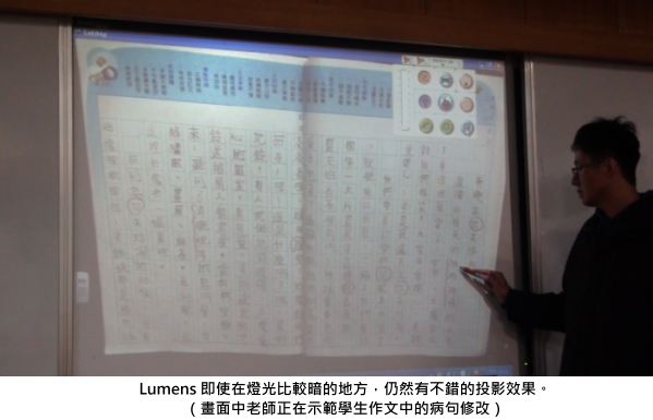 首先,Lumens 實物提示機擁有很棒的畫質:提示機本身在補光、自動對焦的效果上非常好,即使鏡頭要對的地方光線不夠,Lumens 自動補光之後,都可以看得非常清楚,而且在畫質上也相當清晰,這對教學上投影細節的需求是非常重要的。而在教室常常因為要開投影機的關係,前排的電燈往往是關掉的,容易造成光線不足,但是 Lumens 實物提示機就不會有這樣的問題!