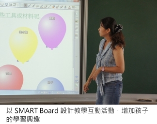 教師嘗試設計跨領域統整相關單元的課程,進行主題教學,減少不同版本教科書的重複內容。教師善用電子書及結合電子白板等資訊設備,引進 SMART Board 電子白板之後,為教學過程增添很多驚喜與期待,學生躍躍欲試想學會操作電子白板,在電子白板上能及時點選圖示,進行抽象概念或具體實物解說,讓學生能更具體清楚了解教師所傳達的內容,教師也免除傳統掛圖教具來回張貼的不便,並且提高學生學習興趣,提升互動機會,讓學生自然而然成為學習的主角。教師除了使用 SMART Board 電子白板後,更結合了實物投影機,展示學生個別作品,也能同時分享討論小組或個人的作品,學生參與度會大幅提升,在學習上也獲得肯定。