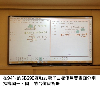有了 SMART Board 這優良的硬體,再加上所附的 Notebook 教材編輯軟體功能著實非常強大,接下來就得規劃整個教材的編篡了,這才是進入E化教學真正的核心,以數學科為例,大致上先規劃出題目頁與講解頁的標準格式,搭配的音效與短音樂,符合主旨的超連結等,再以發包的方式交由各教師與工讀生分單元、冊別完成初稿,最後再由本人後製動畫特效,完稿後的教材則置於雲端分享給班內各教師,可隨帶班的狀態自行修正潤飾,說來容易,但光國中部分至少得製作出 6000 頁 的 Notebook 檔案,如果沒有一個完備的團隊是很難達成這項任務的,而更為珍貴的是這種由教室現場內教師與學生通力合作的E化教材才能真符合教學所需,完全不是廠商所提供的制式教材所能比擬。