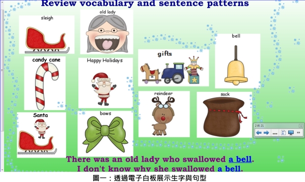 用電子白板展示需要複習的單字句型,這個地方要注意教材的文字字體和圖案呈現需要又大又清楚,坐在後排的學生才能看得清楚(見圖一)。